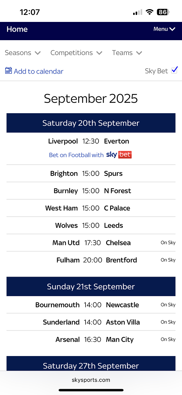 Saturday Sept 20th is the first set of matches.
